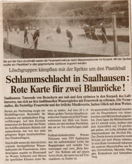 Eine der neuen Attraktionen wurden die Wasserballspiele befreundeter Feuerwehren auf einem 20 mal 10 Meter großen Feld im Park. Mit C- Strahlrohren kämpften jeweils 6 Spieler in 2 x 9 Minuten um einen ca. 50 cm großen Ball. Eine Riesengaudi, bei der nicht nur die Spieler ordentlich nass wurden.