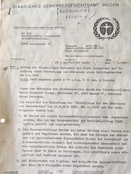 - Genehmigungen des Staatlichen Gewerbeaufsichtsamtes in Siegen an den Stadtdirektor Lennestadt zum Abbrennen eines Groß Feuerwerks gemäss §11 i.Vm §14 Abs.4 LimSchg.