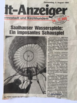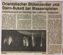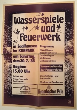 In dieser Zeit dürfte auch der Bau des Fliwatüt fallen, der zentralen Steuereinheit für die einzelnen Wasserdüsen, über die alle Schläuche gesteuert wurden. Die anfänglich mit wenigen Unterwasserscheinwerfern in Eimern illuminierten Wasserfontänen wurden modernisiert und es wurde viel Geld in neue und stärkere Scheinwerfer investiert. Schon damals waren die Wasserspiele und das Feuerwerk weit über Saalhausen bekannt und aus dem gemütlichen Weinfest wurde in den 80-zigern eine Großveranstaltung mit bis zu 7.000- 10.000 begeisterten Zuschauern, die sich das jährliche Spektakel ansahen.