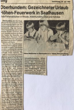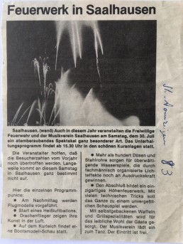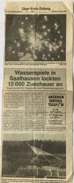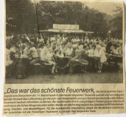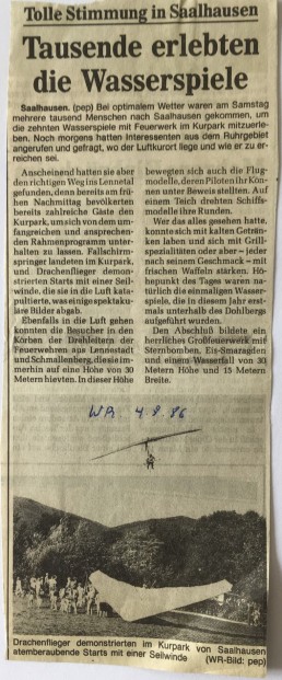 Heißluft Ballons, Flug- und Bootsmodelle, Drachenflieger, 1985 sechs Fallschirmspringer, eine Liveschaltung zum Wetter Satelliten Meteor 1 durch Amateurfunker- man konnte sich sein persönliches Wetter ausdrucken lassen, Kaffee und Kuchen, Unterhaltungsmusik durch den Musikverein Cäcilia Saalhausen und neben dem Höhenfeuerwerk ein Feuerwerkswasserfall aus 30 Metern Höhe.